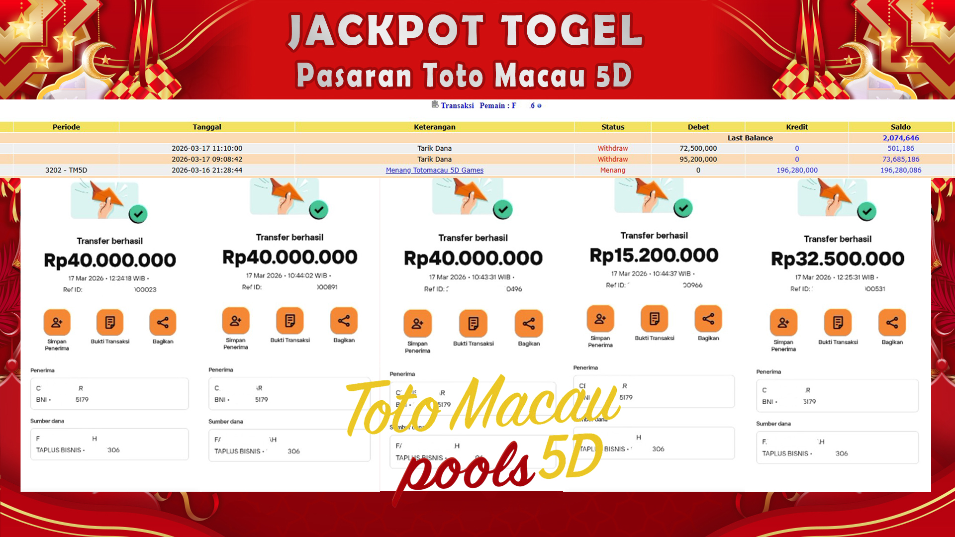 Selamat untuk User ID : Fxxxxx6 berhasil meraih kemenangan besar Rp.196,280,000 ,- Ditotomacau 5D dan berhasil melakukan Penarikan sebesar Rp.167,700,000,-