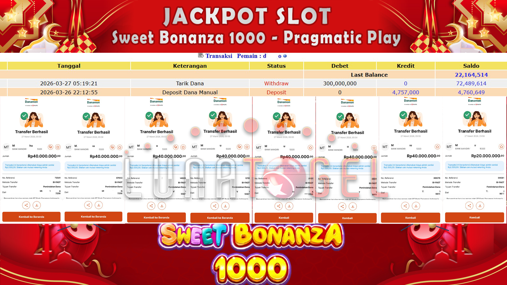 Selamat untuk User ID : dxxxxo berhasil meraih kemenangan besar Rp.300,000,000,,- Di Sweet Bonanza 1000 – Pragmatic Play